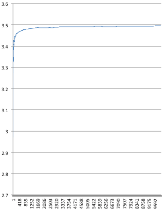 Let’s quickly settle the issue with a simulation so we build on some results. I’ve added the code for simulation here. With this simulation, we see that we start “low”: after 100 rounds the throughput is 2.97, significantly less than 3.5. However after 4600 rounds it’s 3.40…, after 311100 rounds it’s 3.490…, after a million rounds is 3.495…, after 40 millions is 3.4990…, after 1.6 billions is 3.49990… and so on converging to 3.5.