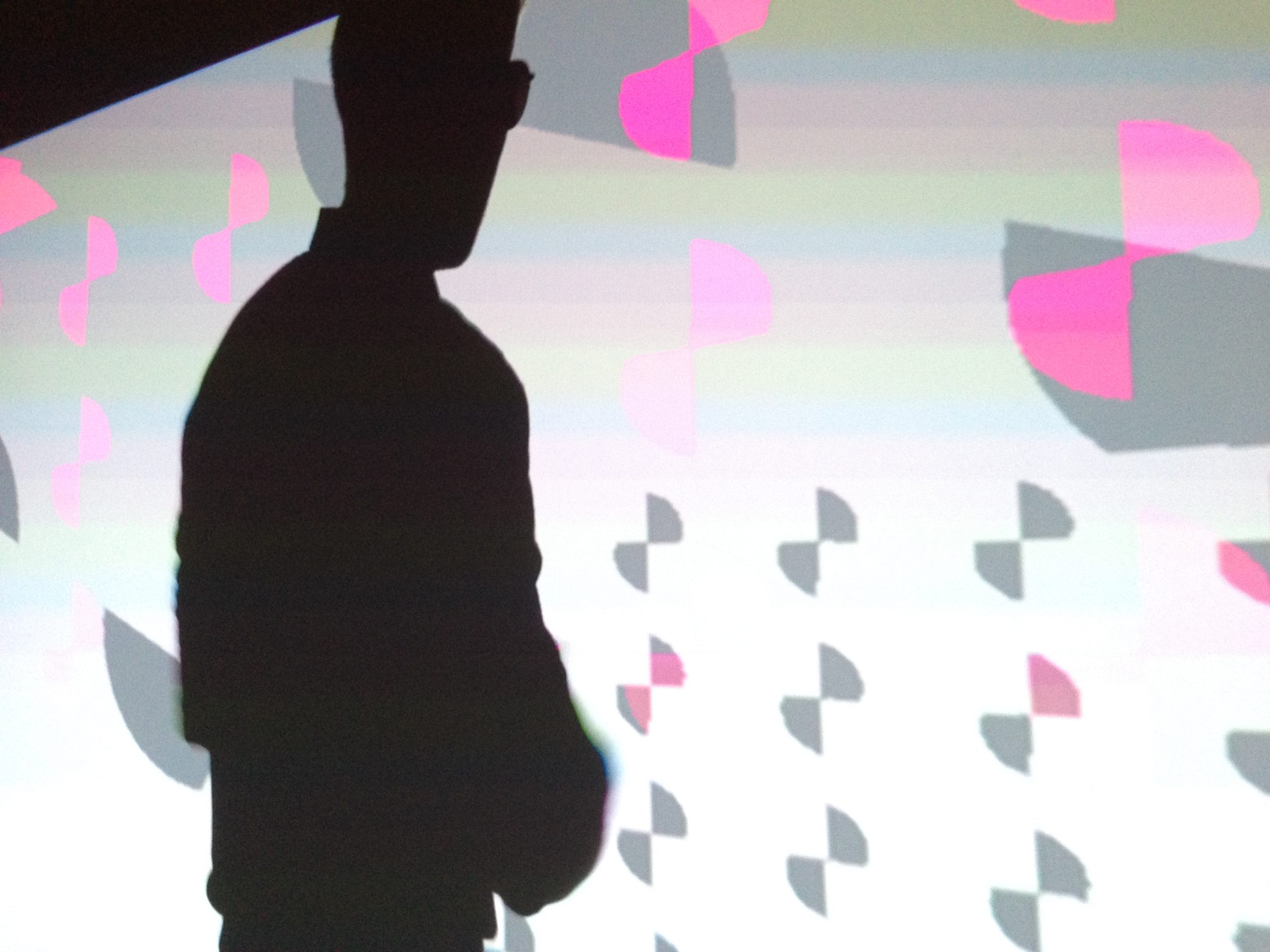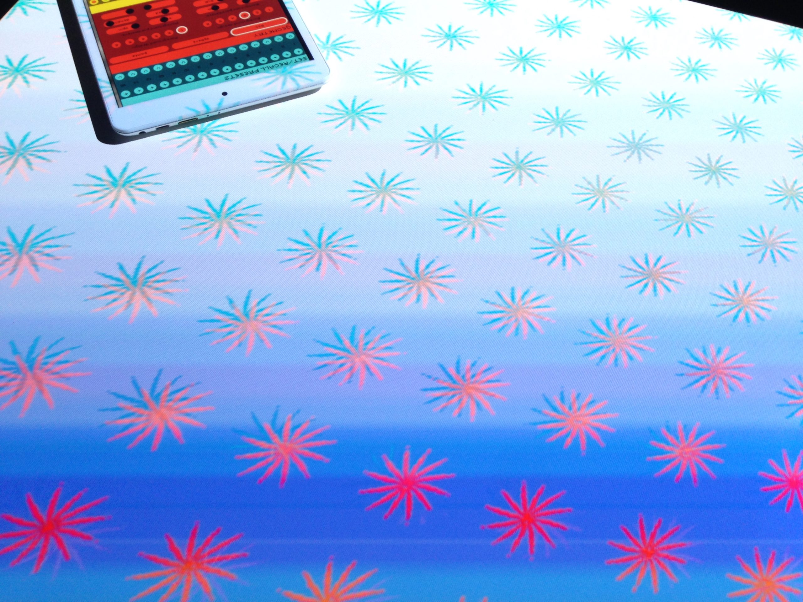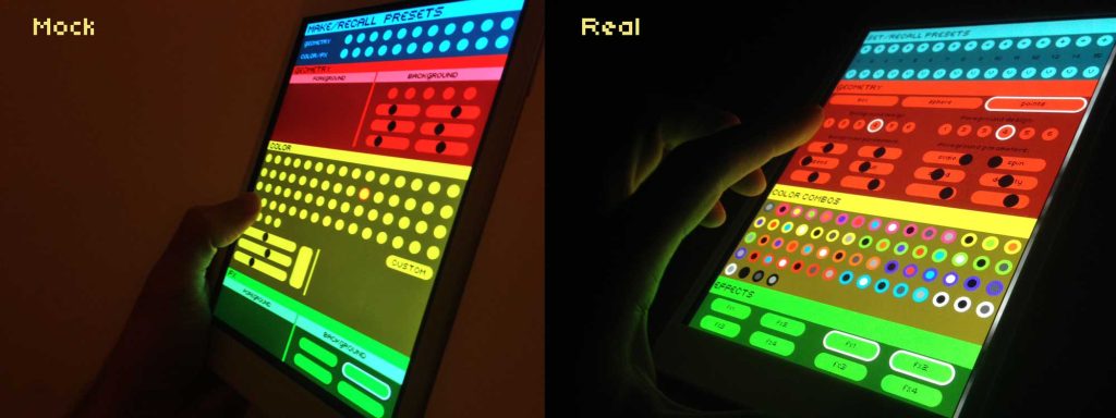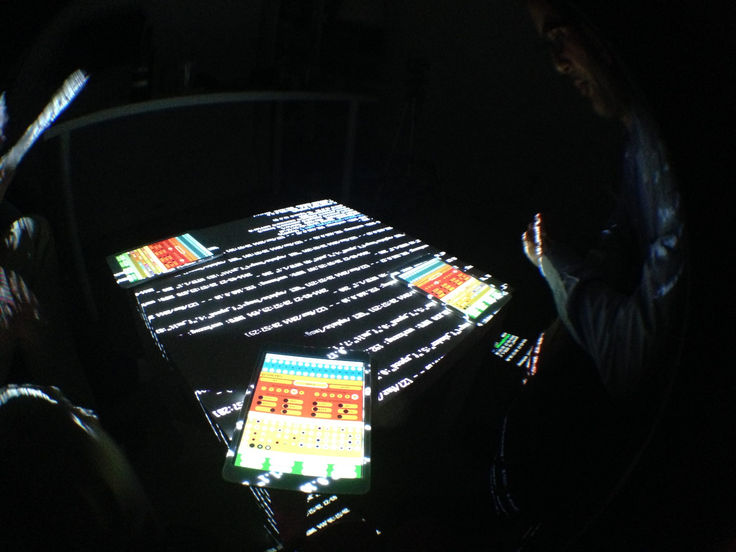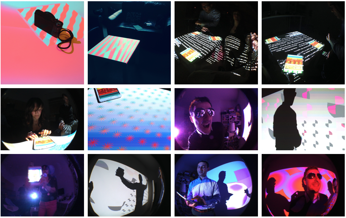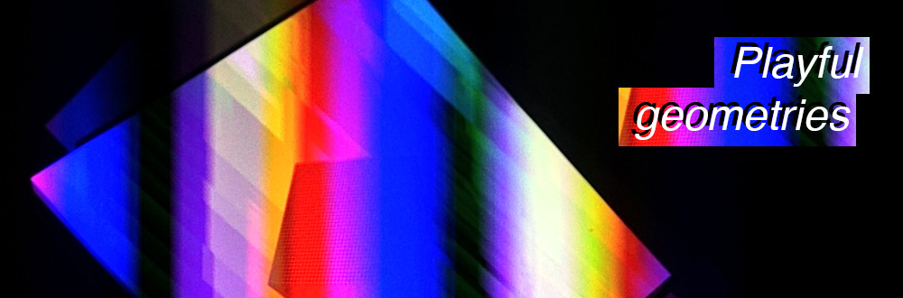 “Playful Geometries” is a nifty coloured and fun installation made by me and Patrick Gaunt (aka paddywwoof) consisting of interactive projections of 3d shapes and patterns. “Playful geometries” is a sound-reactive, multi-user, multi-screen and it scales from coffee-table personal living-room toy to hangar-size premiere-grand-opening scale. Interaction is based on ambient sound and by users tablets controlling the colors, shapes and animations, see presentation video below.