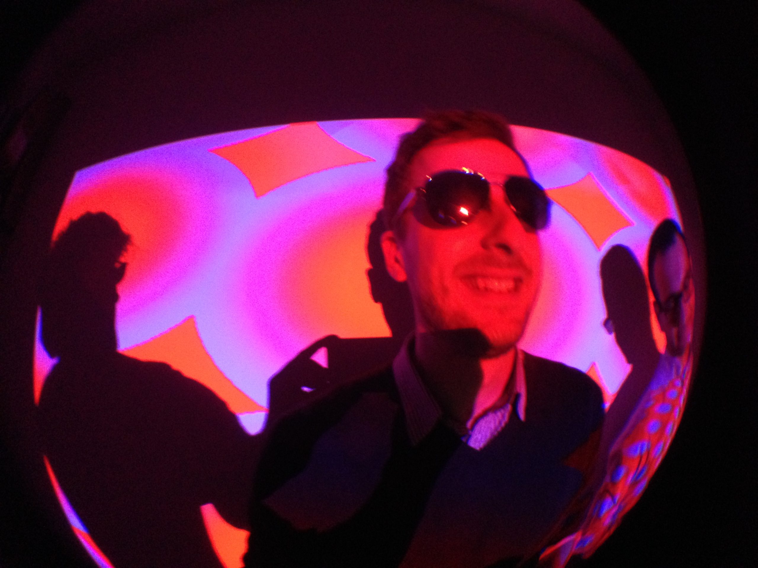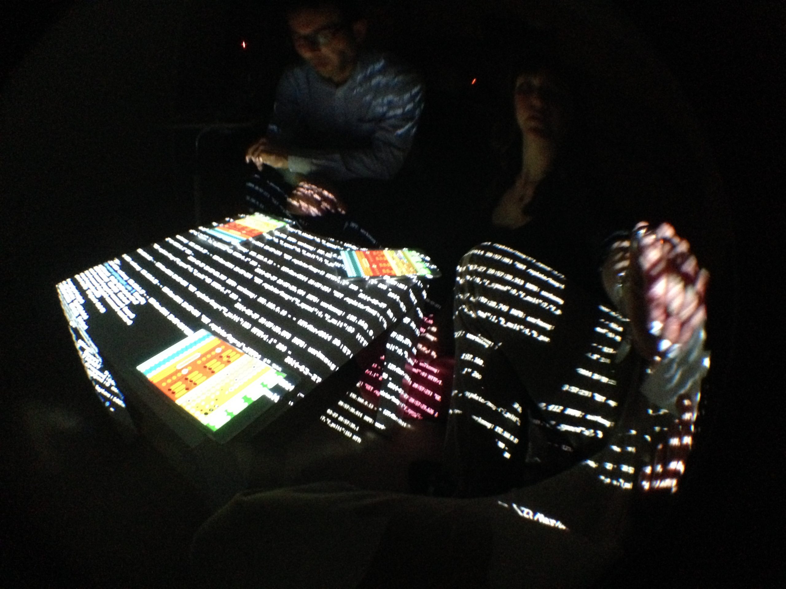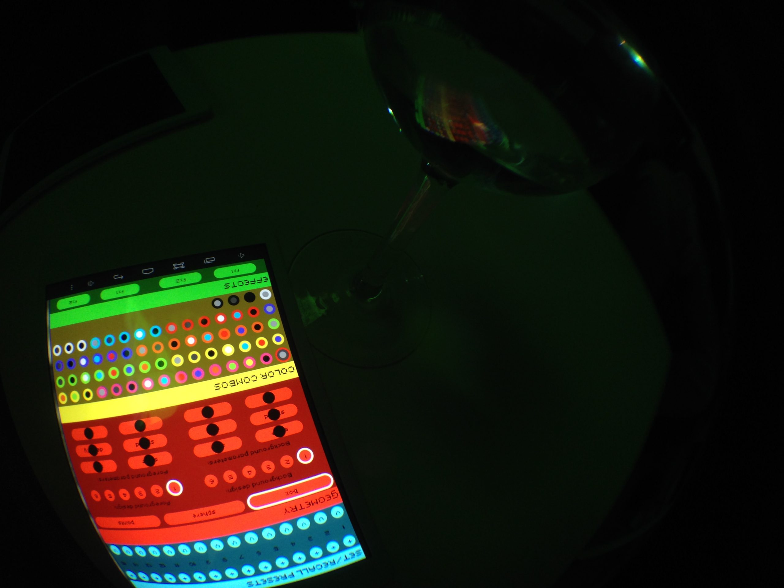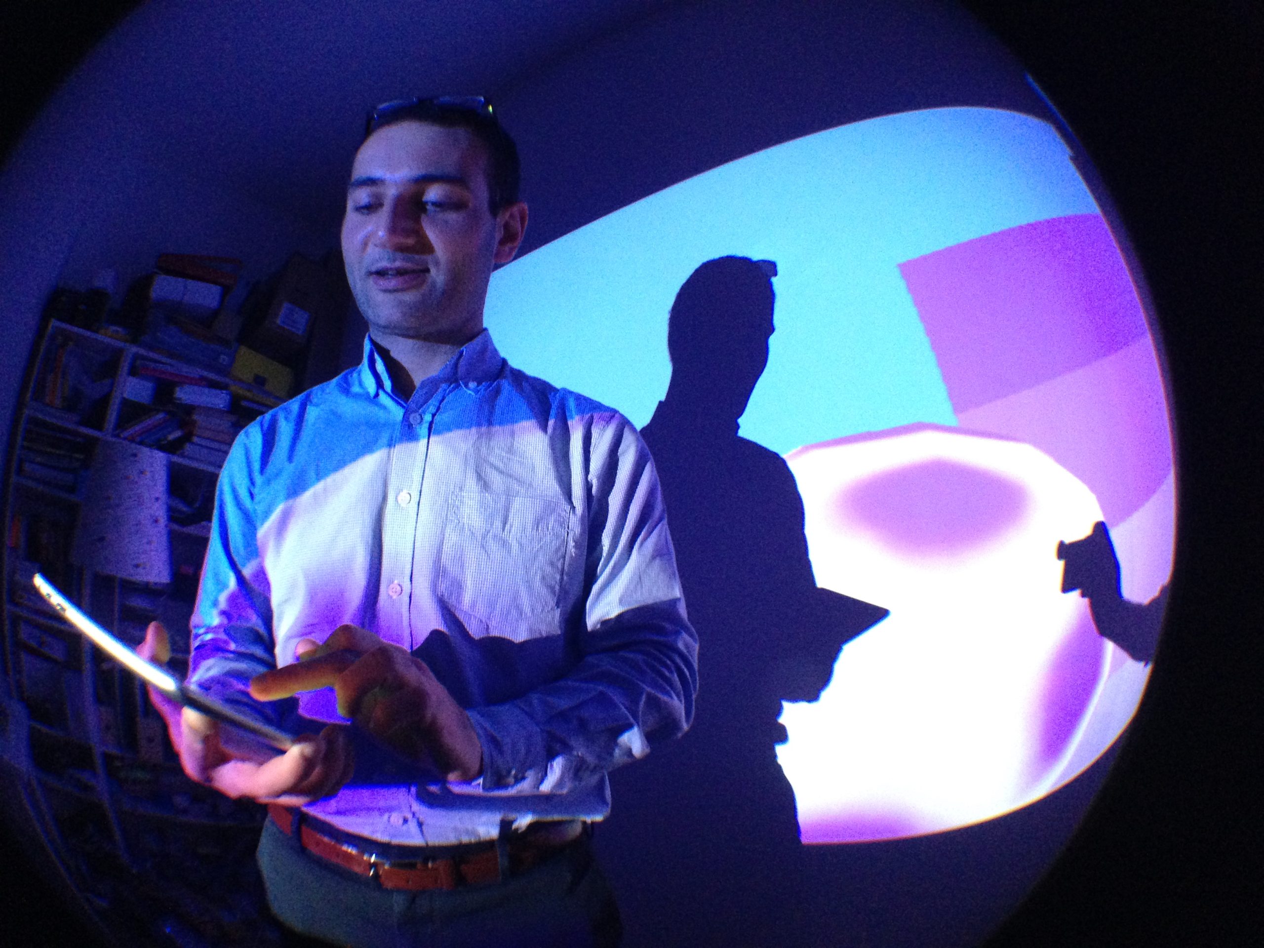 “Playful Geometries” is a nifty coloured and fun installation made by me and Patrick Gaunt (aka paddywwoof) consisting of interactive projections of 3d shapes and patterns. “Playful geometries” is a sound-reactive, multi-user, multi-screen and it scales from coffee-table personal living-room toy to hangar-size premiere-grand-opening scale. Interaction is based on ambient sound and by users tablets controlling the colors, shapes and animations, see presentation video below.