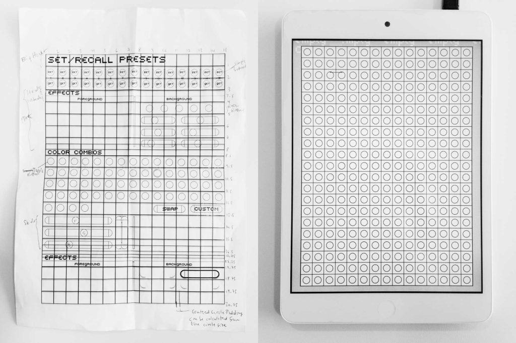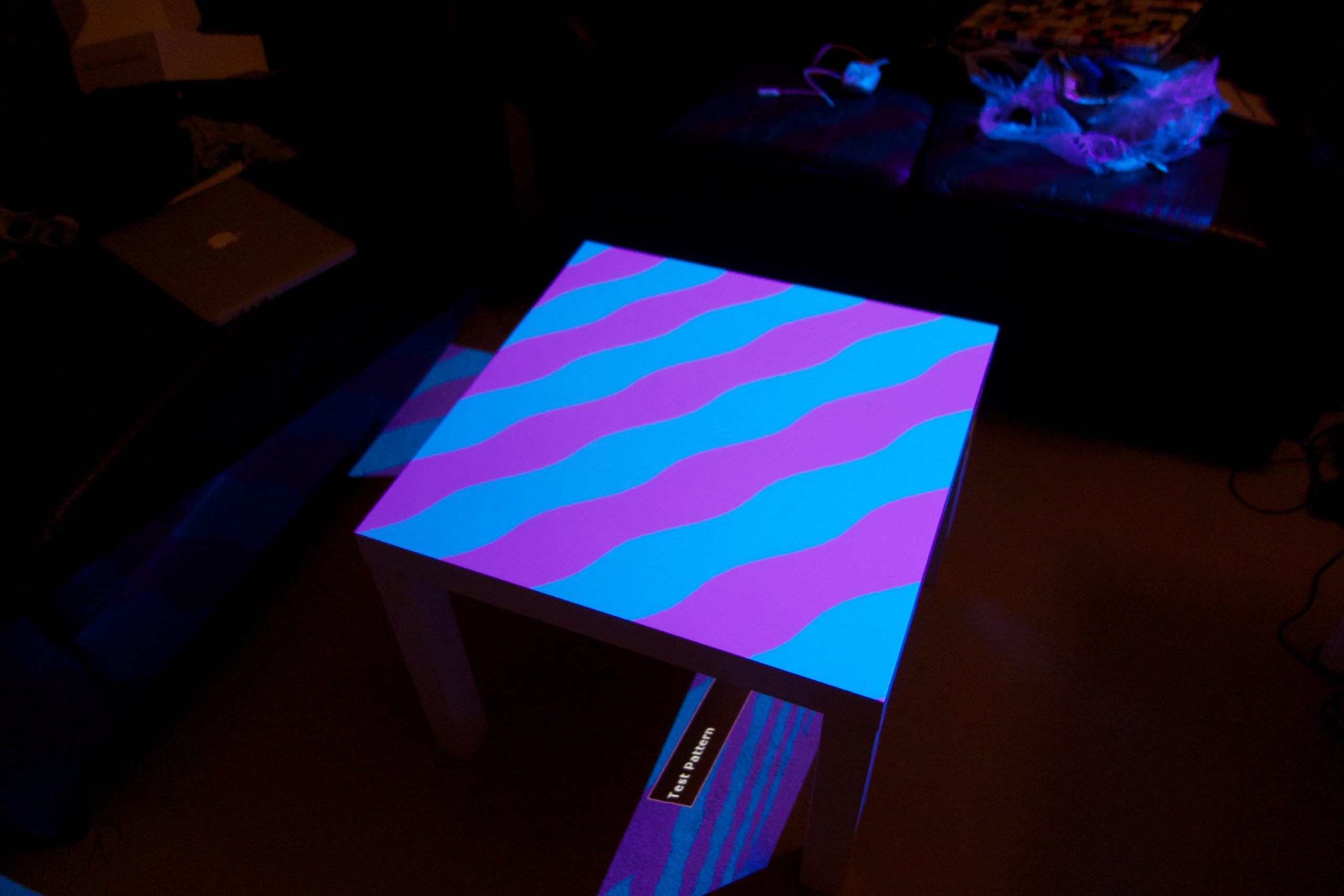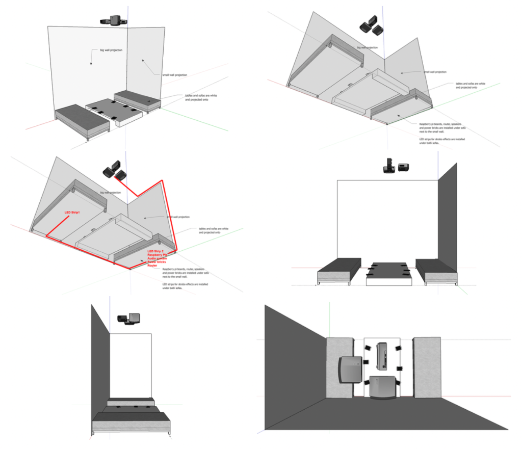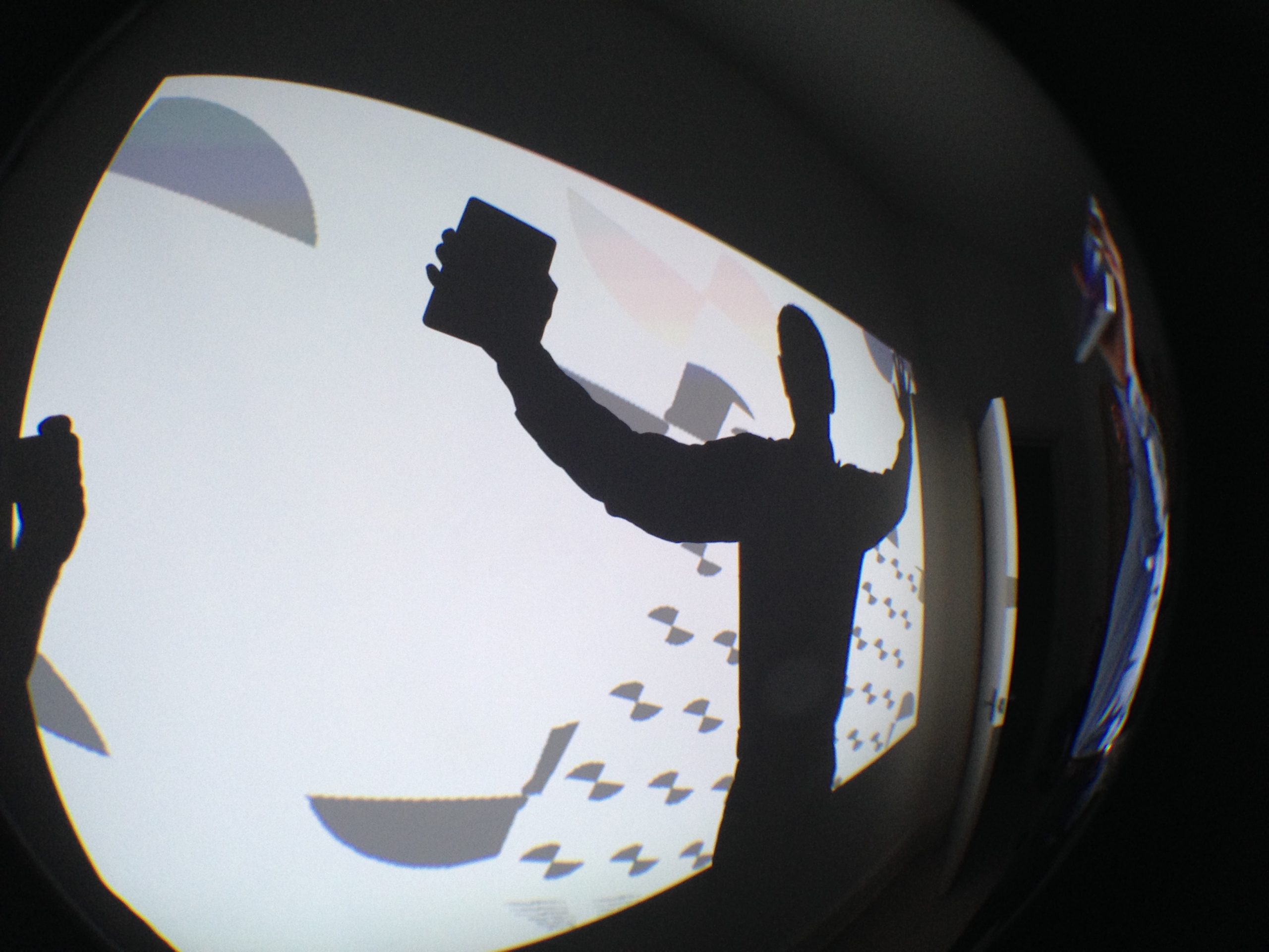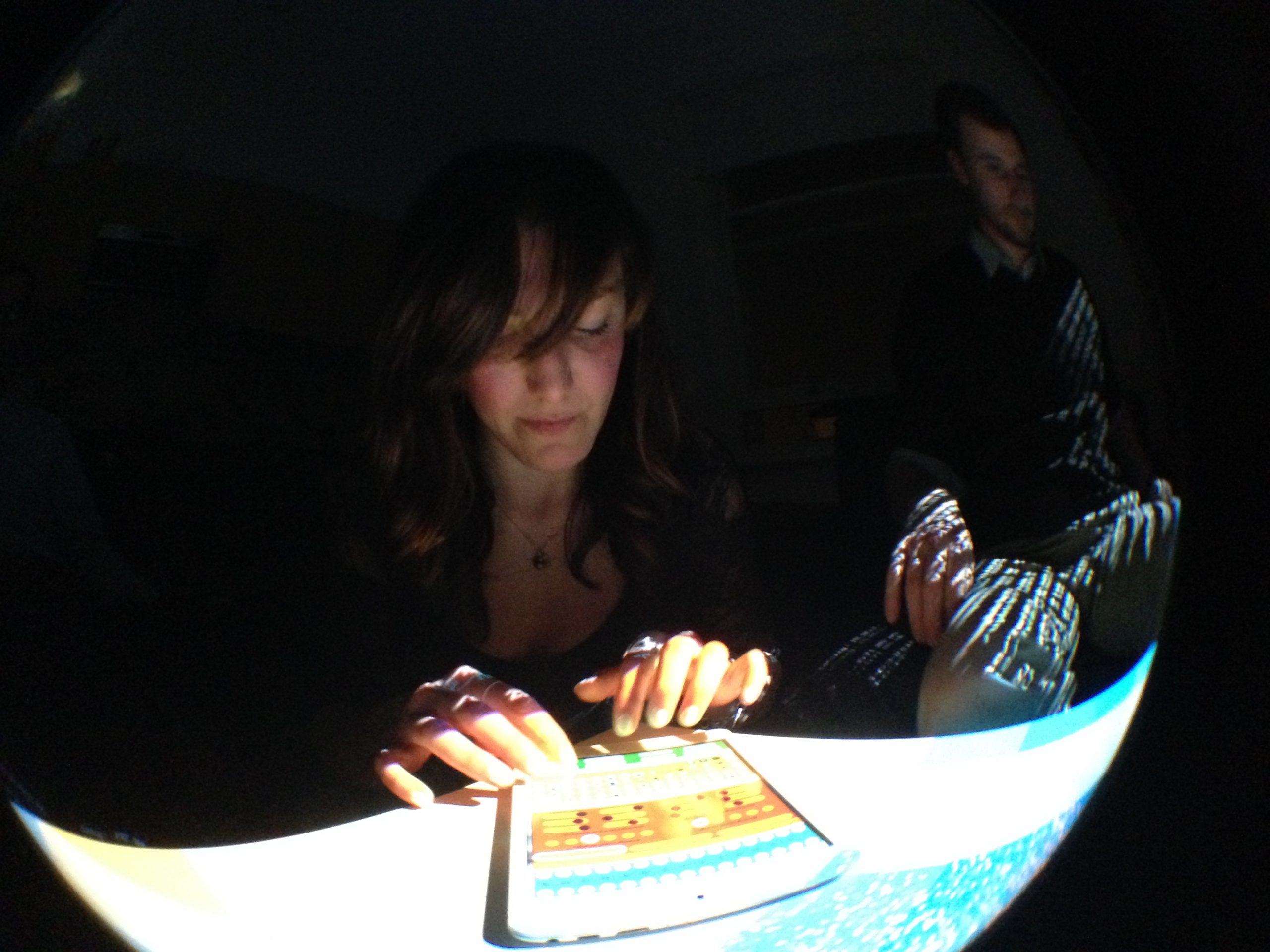 “Playful Geometries” is a nifty coloured and fun installation made by me and Patrick Gaunt (aka paddywwoof) consisting of interactive projections of 3d shapes and patterns. “Playful geometries” is a sound-reactive, multi-user, multi-screen and it scales from coffee-table personal living-room toy to hangar-size premiere-grand-opening scale. Interaction is based on ambient sound and by users tablets controlling the colors, shapes and animations, see presentation video below.