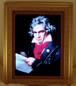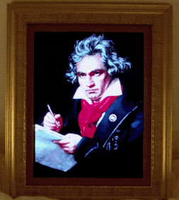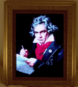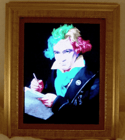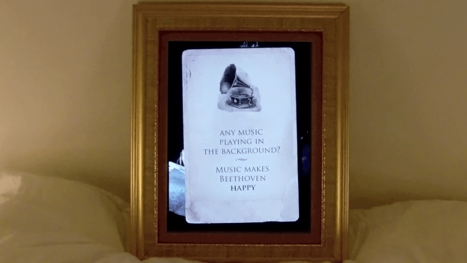 Some stills of Beethoven’s “faces” (normal, holding the phone, “rock”, “zombie”, “Elton John”, “classic music” and, my favourite, “pop”):