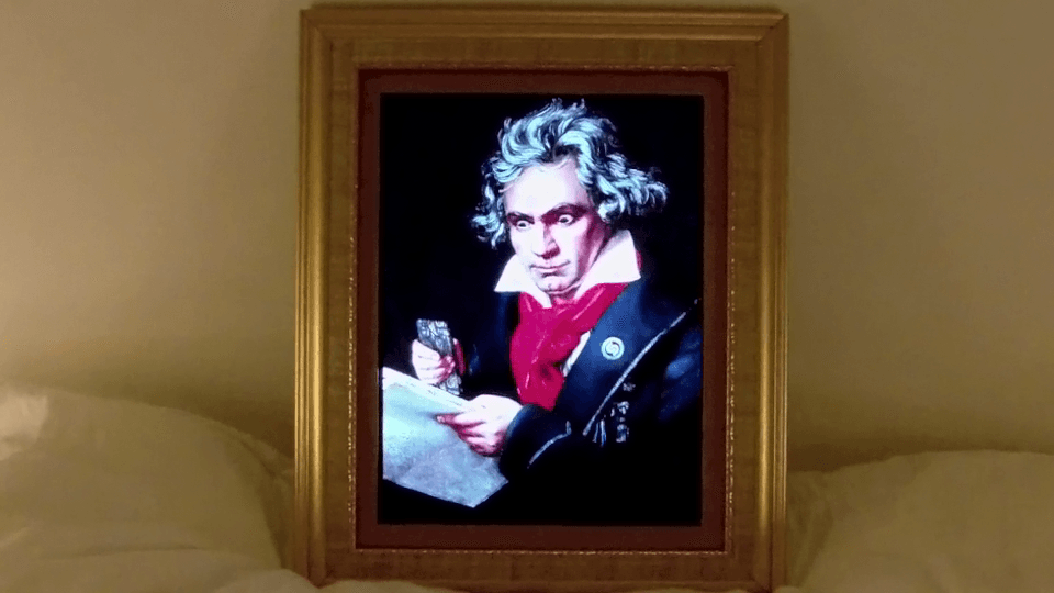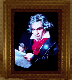 Some extracts of the animations below. Note how the badge glows during recognition, and how Beethoven looks at the phone.